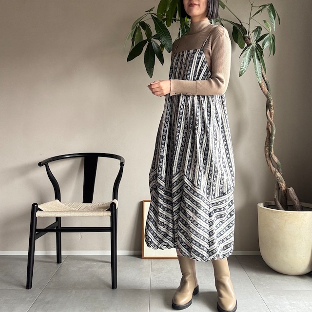 ■ ibuki ■ (イブキ) 【店主身長171cm】 ╍ 商品説明 ╍ en..オリジナル バルーンキャミソールワンピースとは・・・ 職人の手仕事で作られる インドのブロックプリント生地を使用。 ❮裾のバルーンシルエット❯ シンプルながら存在感のある丸いシルエット 8コールのソフトゴムを採用し、足さばきも良く動きやすい仕様に。 ❮スカートの切り替えデザイン❯ 同柄での切り替えでシンプルさは残しつつ、特徴的な切り替えデザインがスカート部分のシルエットのポイントに。 ❮体型やコーデに合わせて調節できるサイズ設計❯ ▣背面ゴムで伸縮性があり、紐でのサイズ調節が可能 ▣肩紐アジャスターで簡単に丈の調節ができる ▣脇のカーブを深めなので、丈を短く調整した場合でも脇の下がつまりにくい ❮ポケット&裏地付き❯ あると便利なポケット付き インド綿の裏地付きで肌触りもよく、透けにくい 着心地の良さとシルエットを追求し、細部までこだわった当店オリジナルのワンピースです。 ■サイズFREE ・総丈約120cm (肩紐アジャスターで115〜125まで調節可能◎) ※148cmのお客様から〜171cm(店主身長)まで着用しております ・胸囲〜108cm ※背中部分にゴム、紐付き ■素材:綿100% ■made in india(生地) made in japan(縫製) ■製品の特性 インドで手作りされている生地のため、 ブロックプリントならではのプリントのズレや濃淡、染料のハネ、などがあります。 既製品にはない手作りの温かみを感じて頂けたら幸いです。 薄い生地の為ひっかけにご注意下さい。 ■お手入れ方法 単独洗いにて中性洗剤をお使いいただき、 冷水で優しく押すように手洗いしてください。 濡れたままの放置は色移りの原因となります。 洗濯後はすぐに形を整え、陰干ししてください。 アイロンは高温を避け、あて布の使用をオススメします。 インド綿は生地によって色落ちしやすいものもございます。 数回の洗濯により徐々に落ち着いてきますので、是非色の変化もお楽しみ下さい。 ■注意事項 ・ご使用のモニターや日光によりお色味の違いが見られる場合がございます。 ・同じ生地で複数製作しております。 カットする場所によって模様の入り方は異なります。掲載している物と同じとは限りませんのでご了承ください。 ・同じ柄のワンピースでも、その都度染料を混ぜて色を作りハンドメイドでプリントしているため、多少の色の違いが出る場合がございます。