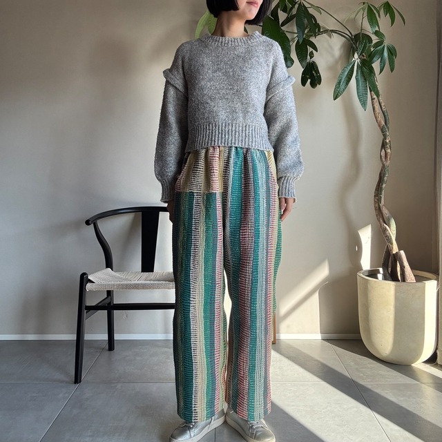■ ユニークストライプ ■ 【店主身長171cm】 ╍ 商品説明 ╍ en..オリジナル ヴィンテージカンタキルトパンツ インドの古布、ヴィンテージのカンタキルトを使用し 一枚のキルトから一本のパンツをお仕立てしました。 それぞれのキルトに異なる柄や風合いがあり、 すべてが世界にひとつだけの一点ものです。 裏地にはやわらかなインド綿を使用しており、 肌あたりも心地よくお楽しみいただけます。 ハイウエスト仕様で、流行のショート丈トップスとの相性も抜群。 トップスをインした着こなしもおすすめです。 ウエストはオールゴム仕様でリラックス感があり、 両サイドにポケット付きです。 ■サイズ 股上32cm(ウエストゴム下から) 股下64cm ウエスト65〜95 ヒップ周り120 ■素材:綿100% ■made in india(生地) made in japan(縫製) ■製品の特性 こちらのアイテムは、インドの伝統的な刺し子布 「カンタキルト」を仕立てた一点もののパンツです。 使用している生地は、古いサリー(女性の衣服)や ドウティ(男性の腰布)などを何枚も重ね、 ひと針ひと針手縫いで仕立てられたヴィンテージの布になります。 長い時間をかけて人の暮らしとともにあった布のため、 ところどころに小さなシミ・擦れ・色むら・ほつれなどが 見られる場合がございます。 これらは不良ではなく、時を経た布だけがもつ 味わいと個性としてお楽しみください。 生地の厚みや柔らかさにも個体差があり、 ひとつとして同じものはありません。 世界にひとつだけの表情をお届けいたします。 ■お手入れ方法 単独で中性洗剤をお使いいただき、 冷水またはぬるま湯で優しく押し洗いしてください。 洗濯機をご使用の場合は、パンツを裏返してネットに入れ 手洗いコースやデリケートコースなどの弱流水でやさしく洗ってください。 脱水の際はねじらず、押して水気を切り、 清潔なタオルで水気を吸い取ってください。 洗濯機をお使いになる場合は、生地への負担を軽減するため 1〜2分程度の短時間脱水がおすすめです。 厚手の生地のため、乾燥には時間がかかります。 お天気のよい日に、風通しのよい日陰で自然乾燥させてください。 ■注意事項 ・ご使用のモニター環境や撮影時の光の当たり方により、 実際の色味と異なって見える場合がございます。 ・ヴィンテージ生地を使用しているため、繊細な部分がございます。 お取り扱いにはご注意ください。 ・海外製品特有のにおいを感じる場合がございますが、 風通しの良い場所で陰干ししていただくことで軽減されます。
