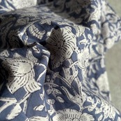 ブロックプリントならではのプリントのズレや濃淡、染料のハネ、などがあります。