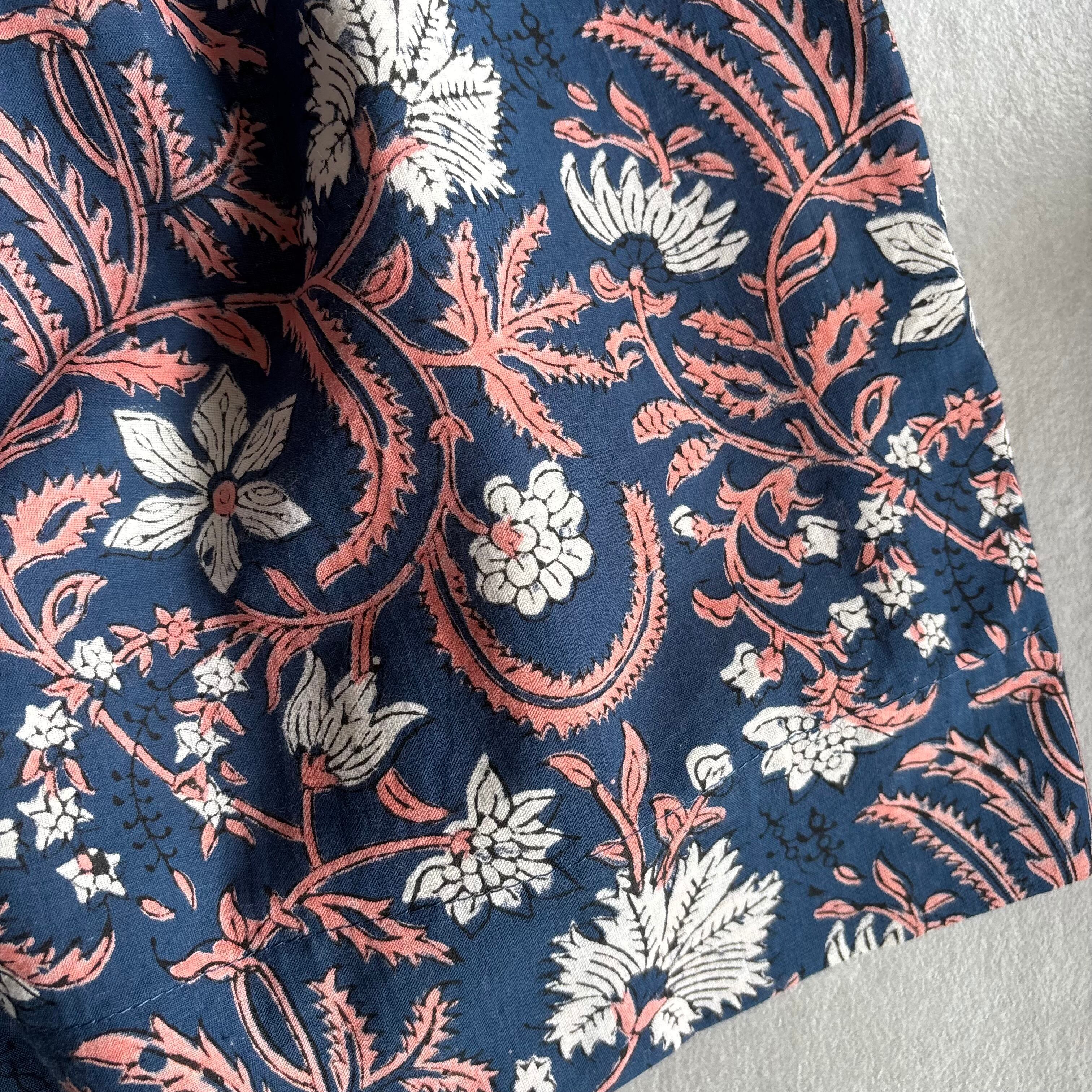 ブロックプリントならではのプリントのズレや濃淡、染料のハネ、などがあります。